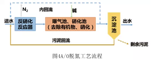 1973年,Barnard在原有工藝基礎(chǔ)上,將缺氧和好氧反應(yīng)器完全分隔,污泥回流到缺氧反應(yīng)器,并添加了內(nèi)回流裝置,縮短了工藝流程,也就現(xiàn)在常說(shuō)的缺氧好氧(A/O)工藝(如圖4)。