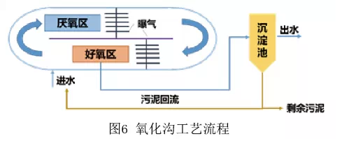A2O工藝是將生物處理厭氧段和好氧段進(jìn)行了空間分割,而氧化溝則為封閉的溝渠型結(jié)構(gòu),結(jié)合了推流式和完全混合式活性污泥法的特點(diǎn),集曝氣、沉淀和污泥穩(wěn)定于一體。污水和活性污泥的混合液不斷地循環(huán)流動(dòng),系統(tǒng)中能夠形成好氧區(qū)和缺氧區(qū),進(jìn)而實(shí)現(xiàn)生物脫氮除磷(如圖6)。氧化溝白天進(jìn)水曝氣,夜間用作沉淀池。活性污泥法相比 , 其具有處理工藝及構(gòu)筑物簡(jiǎn)單、泥齡長(zhǎng)、剩余污泥少且容易脫水、處理效果穩(wěn)定等優(yōu)勢(shì)。
