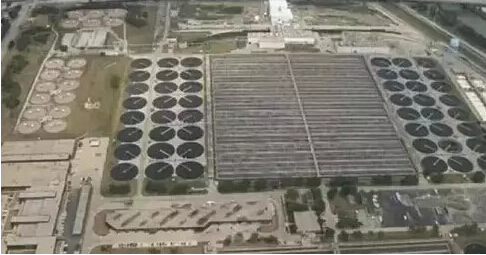 底特律污水處理廠采用的是純氧曝氣工藝,矩形的曝氣池全部封閉。該廠有25座直徑為60米的周邊進(jìn)水、周邊出水的二沉池,出水采用加氯消毒,消毒后排入底特律河。