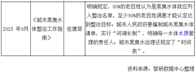 中國產(chǎn)業(yè)信息網(wǎng)發(fā)布的《2015-2020年中國污水處理行業(yè)運(yùn)行態(tài)勢及投資戰(zhàn)略研究報(bào)告》指出:近年政府部門出臺的水環(huán)境治理各項(xiàng)政策中,尤以2015年4?月出臺的《水污染防治行動計(jì)劃》(“水十條”)和9?月出臺的《城市黑臭水體整治工作指南》最具有針對性,開明確提出了我國黑臭水體治理的時(shí)間節(jié)點(diǎn)和流程: