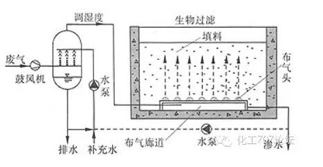 脫臭原理:惡臭氣體經(jīng)過(guò)去塵增濕或降溫等預(yù)處理工藝后,從濾床底部由下向上穿過(guò)由濾料組成的濾床,惡臭氣體由氣相轉(zhuǎn)移至水—微生物混和相,通過(guò)固著于濾料上的微生物代謝作用而被分解掉