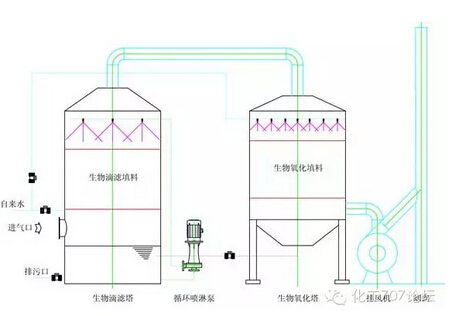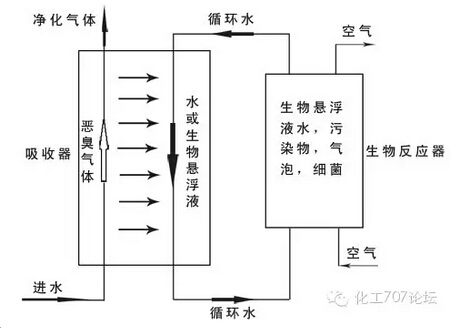 脫臭原理:將惡臭物質(zhì)和含懸浮物泥漿的混和液充分接觸,使之在吸收器中從臭氣中去除掉,洗滌液再送到反應(yīng)器中,通過(guò)懸浮生長(zhǎng)的微生物代謝活動(dòng)降解溶解的惡臭物質(zhì)