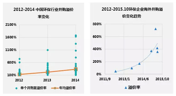 首先,標的明顯變貴了。根據(jù)對2012-2014幾年間數(shù)百個并購案例的統(tǒng)計分析,無論是國內(nèi)還是海外的環(huán)保類標的在幾年間的資產(chǎn)溢價率(溢價部分/凈資產(chǎn))都呈現(xiàn)逐年增長的趨勢,目前都達到了400%左右水平。從供需關系角度解釋,并購市場的買方需求這家更加明顯,優(yōu)質標的價格水漲船高。