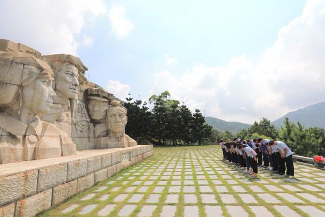 沿著山道拾級而上,大家又來到了長樂地下黨革命烈士紀念園。160個臺階代表160名英勇犧牲的烈士。臺階的盡頭,是一組氣勢磅礴的雕塑“浩氣長存”,用花崗巖塑造的一群英勇不屈的共產(chǎn)黨人,讓海環(huán)的年輕黨員們肅然起敬。