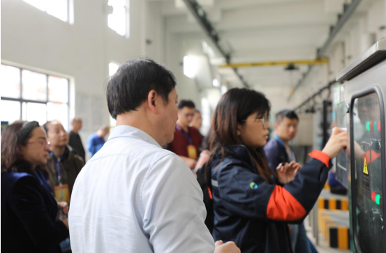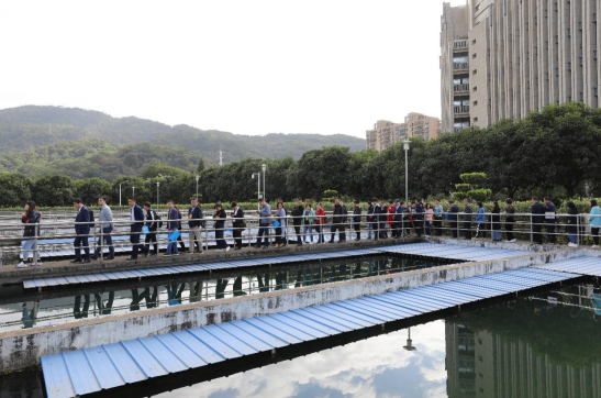 來賓首先參觀了集團企業(yè)文化主題館,認真細致地了解集團的發(fā)展歷史、業(yè)務版圖以及污水處理和固廢業(yè)務的發(fā)展情況。隨后,大家步行參觀洋里廠區(qū),實地考察了二沉池、生反池的工藝原理。在洋里四期的膜處理車間,陪同講解的技術人員結合現(xiàn)場1:1的膜架復制品,詳細介紹了MBR膜處理工藝和該工藝對出水水質(zhì)的提升作用,讓來賓們大開眼界。