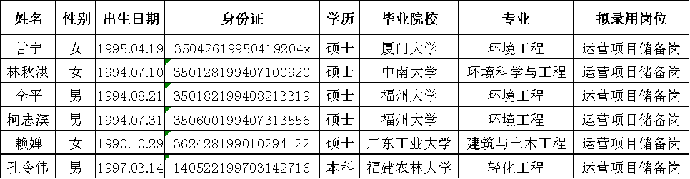 根據(jù)國家人社部要求,現(xiàn)將福建海峽環(huán)保集團股份有限公司擬錄用2020屆畢業(yè)生情況予以公示,公示名單如下: