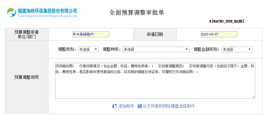 為進(jìn)一步加強(qiáng)集團(tuán)內(nèi)部管控的精細(xì)化、提升預(yù)算管理水平,根據(jù)董事長(zhǎng)辦公會(huì)會(huì)議紀(jì)要(董辦〔2020〕1號(hào))要求,企業(yè)發(fā)展部修訂完善、并經(jīng)總裁審批后于4月27日發(fā)布了《全面預(yù)決算管理制度》;為配合全面預(yù)算工作順利開(kāi)展,同時(shí)上線“全面預(yù)算調(diào)整審批單”流程。