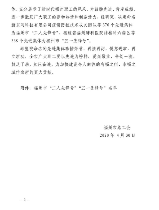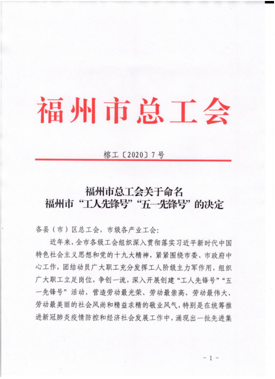 4月30日,福州市總工會授予集團下屬福建榕東海峽環(huán)保有限公司青洲污水處理廠、福建海峽環(huán)保資源開發(fā)有限公司益鳳建筑垃圾資源化項目部(以下簡稱“青洲污水廠”、“益鳳項目部”)“工人先鋒號”榮譽稱號。