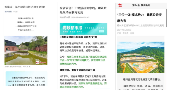近期,福州日?qǐng)?bào)、福州晚報(bào)、海峽都市報(bào)等多家媒體紛紛聚焦海資公司在建筑垃圾資源化利用領(lǐng)域的創(chuàng)新舉措,以頭版、專版等方式深度報(bào)道海資公司首創(chuàng)的“三位一體”模式。