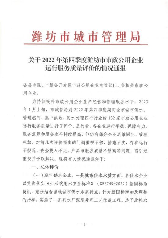 近日,山東省濰坊市發(fā)布市政公用企業(yè)運(yùn)行服務(wù)質(zhì)量評價情況通報,山東壽光海峽環(huán)??萍加邢薰荆ㄒ韵潞喎Q“壽光公司”)在2022年第四季度濰坊市市政公用企業(yè)運(yùn)行服務(wù)質(zhì)量評價中,榮獲濰坊地區(qū)40家污水處理企業(yè)評比第一名。