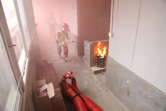 當(dāng)天演訓(xùn)分為三個階段。初期火災(zāi)階段由扮演電焊施工的工作人員進(jìn)入現(xiàn)場作業(yè),并點燃室內(nèi)易燃物,扮演監(jiān)護(hù)人的學(xué)員現(xiàn)場予以處置;火災(zāi)發(fā)展階段由裁判組向參訓(xùn)人員發(fā)出火勢發(fā)展的信息,并在室內(nèi)預(yù)設(shè)的著火點起明火,過程中由專人扮演受傷人員,要求扮演班組級救援力量的學(xué)員予以處置;最后的全面總攻階段繼續(xù)在預(yù)設(shè)的多處著火點起明火,并在演訓(xùn)現(xiàn)場的房間內(nèi)放置假人模擬暈倒人員,要求扮演公司級應(yīng)急救援力量的學(xué)員,會同前期趕赴現(xiàn)場的學(xué)員協(xié)同予以處置。
