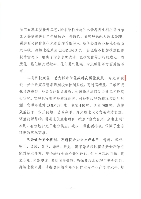 壽光公司依托集團(tuán)先進(jìn)的污水處理技術(shù)和智慧水務(wù)管理系統(tǒng),通過智能化、自動(dòng)化手段優(yōu)化工藝流程,實(shí)現(xiàn)污水處理效率和節(jié)能減排雙提升。公司通過升級(jí)精準(zhǔn)藥劑投加控制系統(tǒng),實(shí)現(xiàn)了遠(yuǎn)程監(jiān)控和精準(zhǔn)調(diào)控,年減排COD?4270噸、氨氮440噸、總氮700噸,有效降低了單位污水處理的能耗和碳排放量,在節(jié)能減排方面取得了顯著成效。
